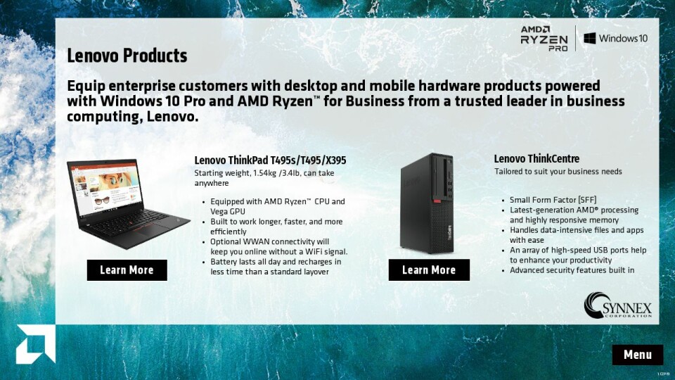 Equip enterprise customers with desktop and mobile hardware products powered with Windows 10 Pro and AMD Ryzen™ for Business from a trusted leader in business computing, Lenovo.