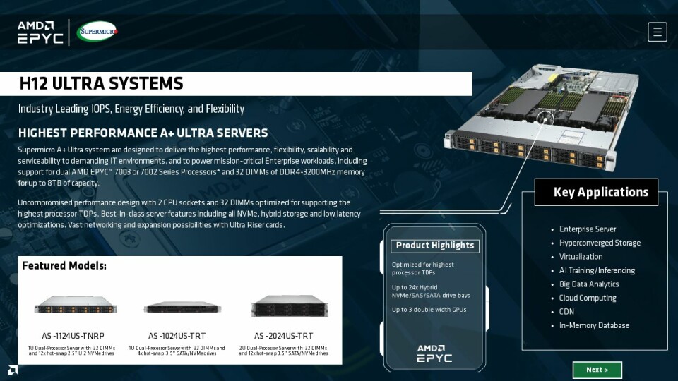 Supermicro A+ Ultra system are designed to deliver the highest performance, flexibility, scalability and serviceability to demanding IT environments, and to power mission-critical Enterprise workloads, including support for dual AMD EPYC™ 7003 or 7002 Series Processors* and 32 DIMMs of DDR4-3200MHz memory for up to 8TB of capacity.