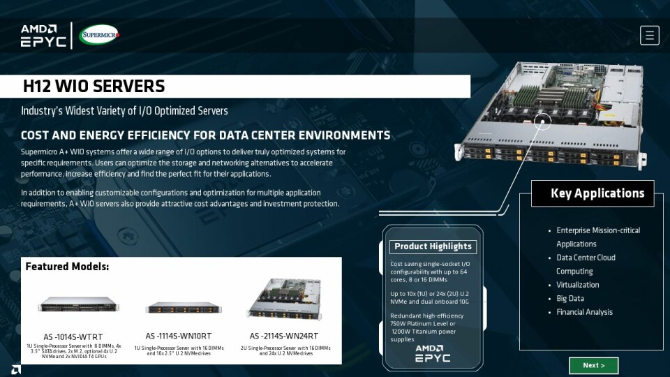 Supermicro A+ WIO systems offer a wide range of I/O options to deliver truly optimized systems for specific requirements. Users can optimize the storage and networking alternatives to accelerate performance, increase efficiency and find the perfect fit for their applications.
