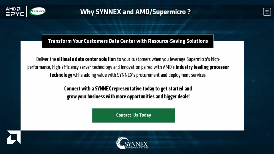 Deliver the ultimate data center solution to your customers when you leverage Supermicro's high-performance, high-efficiency server technology and innovation paired with AMD's industry leading processor technology while adding value with SYNNEX's procurement and deployment services.