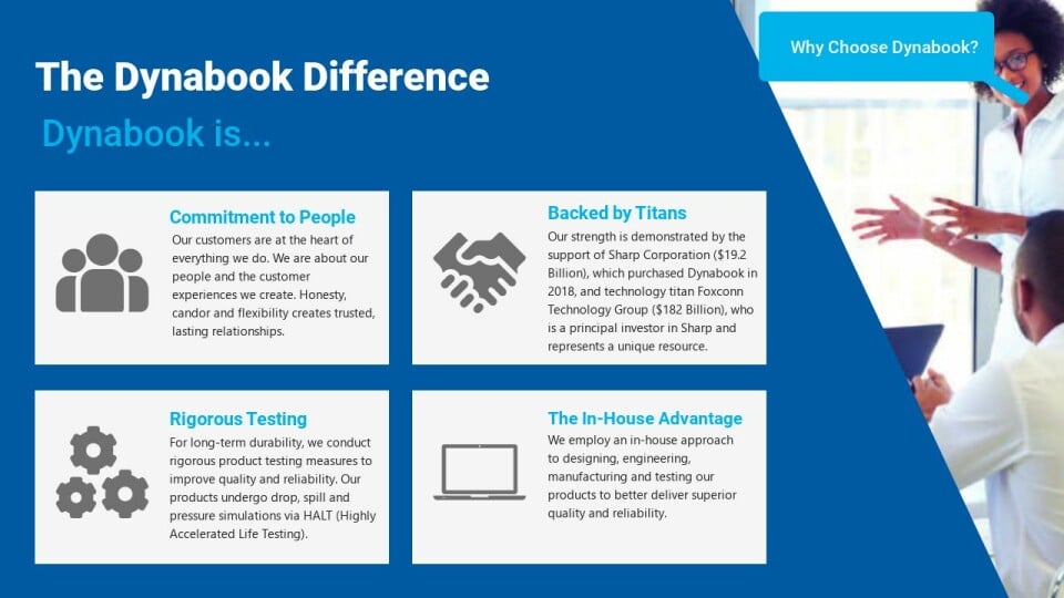 Our strength is demonstrated by the support of Sharp Corporation ($19.2 Billion), which purchased Dynabook in 2018, and technology titan Foxconn Technology Group ($182 Billion), who is a principal investor in Sharp and represents a unique resource.