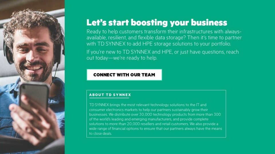Ready to help customers transform their infrastructures with always-available, resilient, and flexible data storage? Then it’s time to partner with TD SYNNEX to add HPE storage solutions to your portfolio.