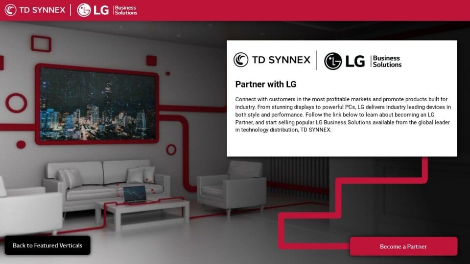 Connect with customers in the most profitable markets and promote products built for industry. From stunning displays to powerful PCs, LG delivers industry leading devices in both style and performance. Follow the link below to learn about becoming an LG Partner, and start selling popular LG Business Solutions available from the global leader in technology distribution, TD SYNNEX.