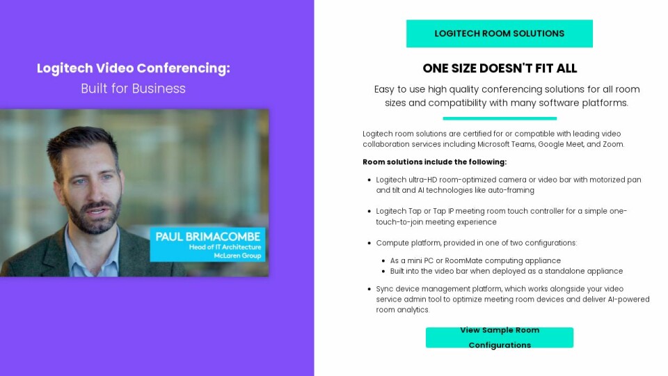 - Logitech ultra-HD room-optimized camera or video bar with motorized pan and tilt and AI technologies like auto-framing