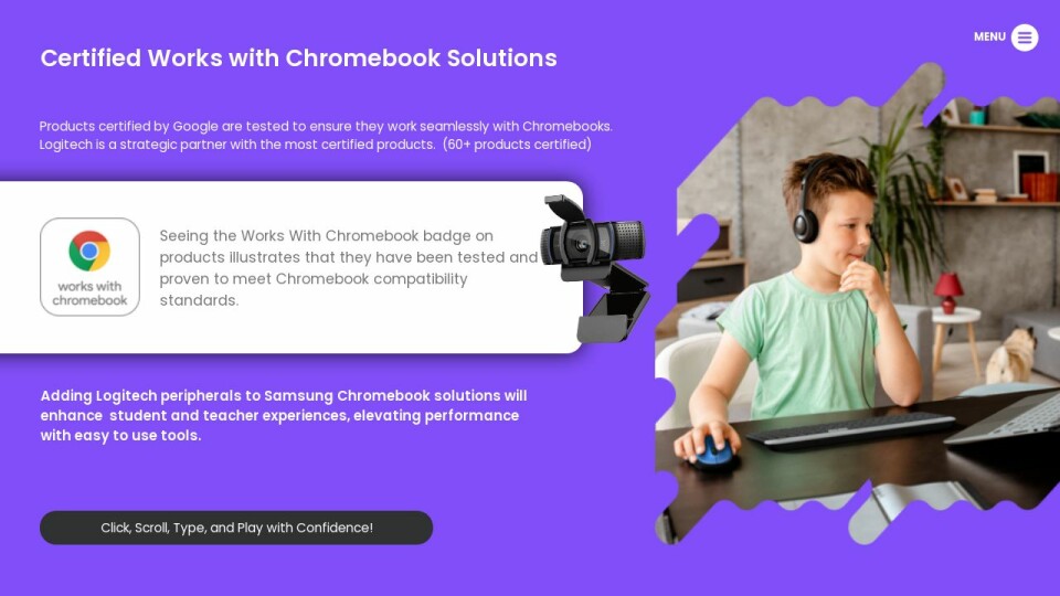 Products certified by Google are tested to ensure they work seamlessly with Chromebooks. Logitech is a strategic partner with the most certified products. (60+ products certified)