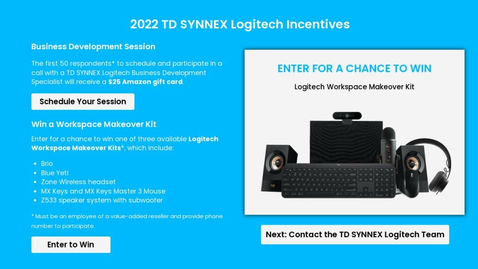 The first 50 respondents* to schedule and participate in a call with a TD SYNNEX Logitech Business Development Specialist will receive a $25 Amazon gift card.