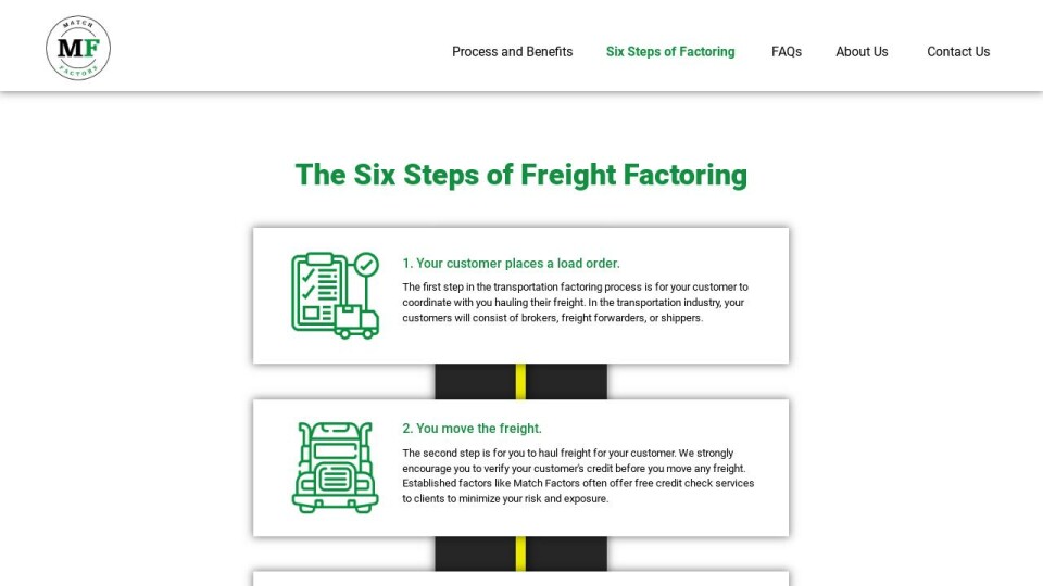 The second step is for you to haul freight for your customer. We strongly encourage you to verify your customer's credit before you move any freight. Established factors like Match Factors often offer free credit check services to clients to minimize your risk and exposure.