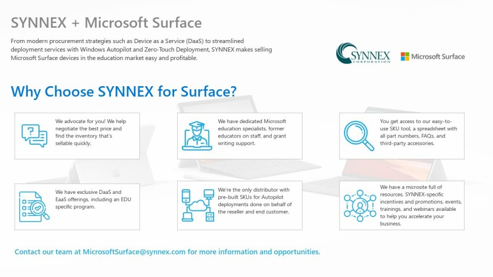 From modern procurement strategies such as Device as a Service (DaaS) to streamlined deployment services with Windows Autopilot and Zero-Touch Deployment, SYNNEX makes selling Microsoft Surface devices in the education market easy and profitable.
