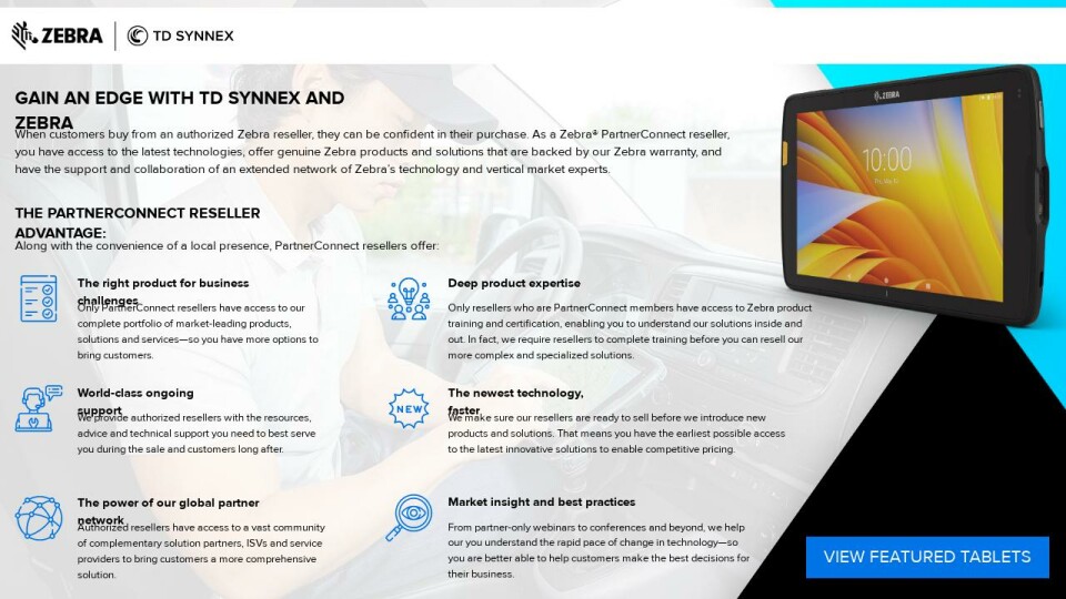 When customers buy from an authorized Zebra reseller, they can be confident in their purchase. As a Zebra® PartnerConnect reseller, you have access to the latest technologies, offer genuine Zebra products and solutions that are backed by our Zebra warranty, and have the support and collaboration of an extended network of Zebra’s technology and vertical market experts.